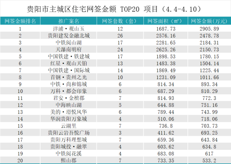 据贵州省房协统计数据,2025年4月4日至2025年4月10日,贵阳主城六区住宅网签金额榜单中: