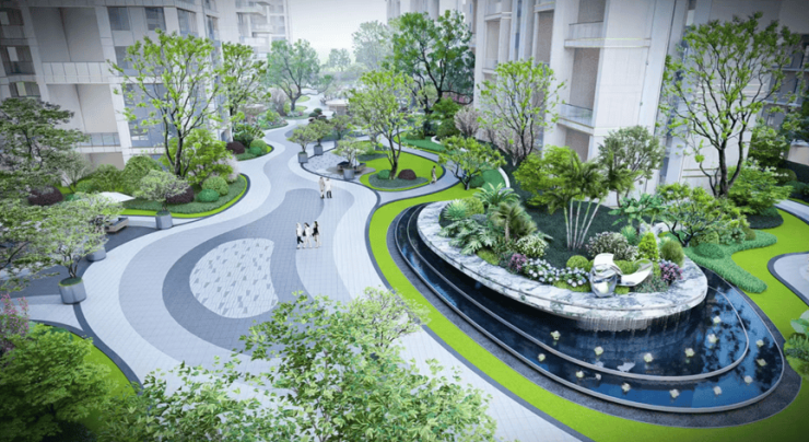 最后是下楼即入园。项目由杭州GAD设计团队精心操刀,以“一湖双园六境”为脉络,17亩中心湖园与8000㎡森境园林相互映衬,园林整体模拟自然林地肌理,采用乔木+灌木+地被三层叠植手法,更从泰山脚下精选20棵全冠泰山松移植入园,成为园林里的自然生态注脚。