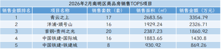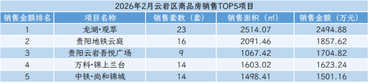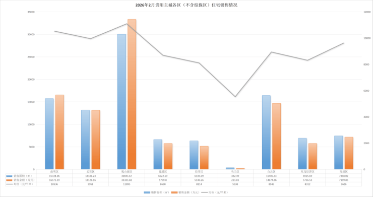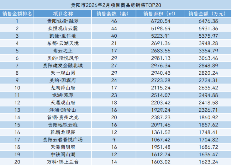 据贵州省房协发布的最新一期贵阳贵安楼市月报,2026年2月份,贵阳市(含三县一市)销售商品房1289套,销售面积14.47万方,销售金额13.47亿元;
