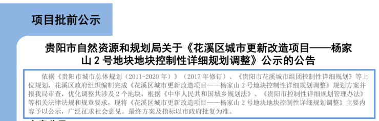 8月6日,据贵阳市自然资源和规划局公示,花溪区城市更新改造项目杨家山2号地块地块控制性详细规划拟进行调整。