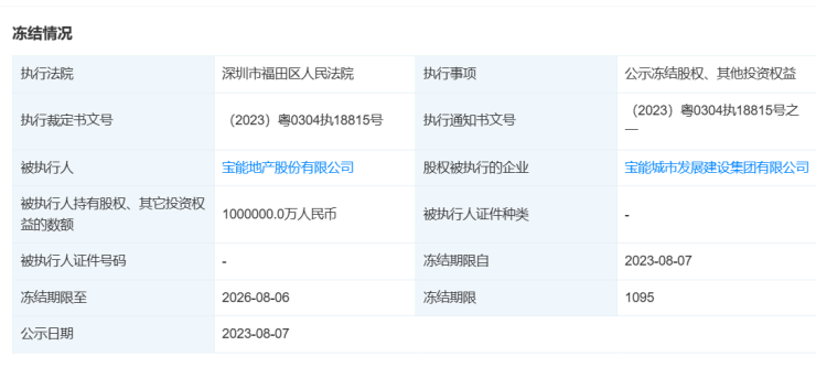 宝能地产持有的宝能城市发展全部股权被冻结,总额100亿元
