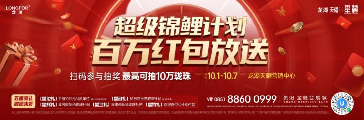 值此热势首开、十一黄金周双喜临门之际,龙湖天曜·星麓为回馈一城菁英之厚爱,特推出超值【超级锦鲤计划】。10月1日-7日,龙湖天曜营销中心,百万红包任性送,扫码即可参与抽奖,较高10万珑珠等你拿!(返还至房款,仅认购签约前使用)