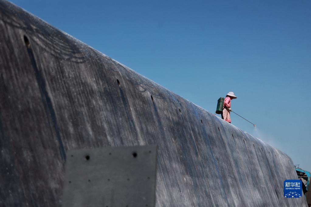 9月21日,一名工人在位于贵州省独山县的贵南高铁项目工地进行喷淋作业。新华社记者 刘续 摄