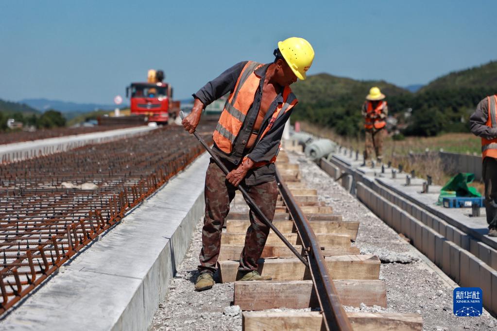 9月21日,工人在位于贵州省独山县的贵南高铁项目工地铺设轨道。