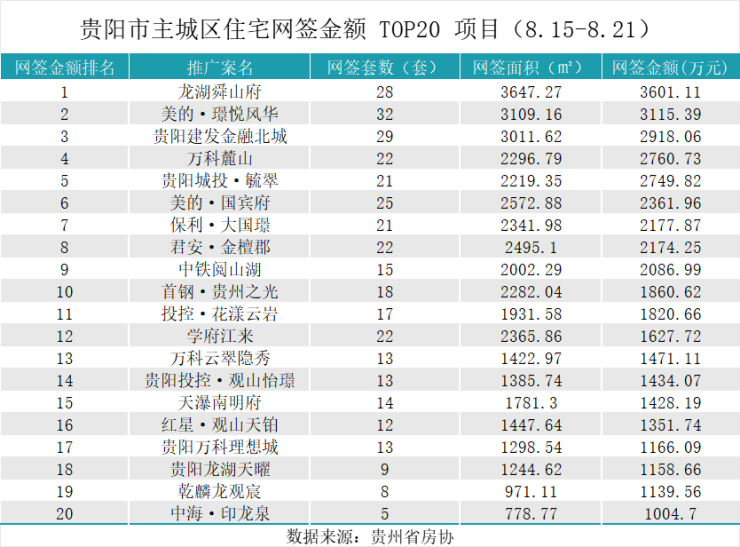 据贵州省房协统计数据,2025年8月15日至2025年8月21日,贵阳主城六区住宅网签金额榜单中: