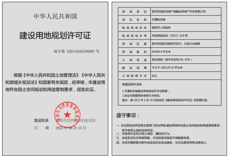 8月19日,据贵阳市自然资源和规划局公示信息,天瀑双龙新项目——天瀑航空城,已获取建设用地规划许可证。