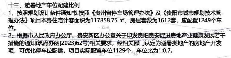“经相关部门认定为避暑类地产的房地产开发项,可优化停车位配建,项目实际配置车位1129个,车位比为1:0.7。”