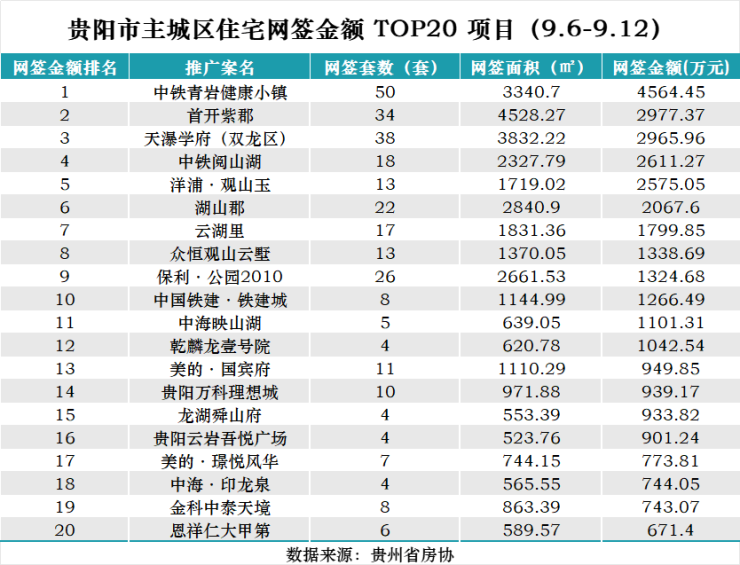 据贵州省房协统计数据,2024年9月6日至9月12日,贵阳主城六区住宅网签金额榜单中: