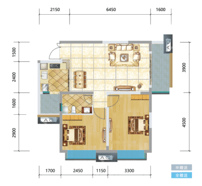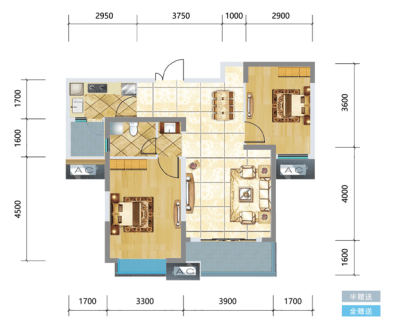 3号房:88.51㎡,两室两厅一厨一卫,布局方正简洁,采光充足。
