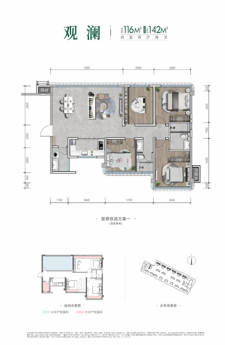 116㎡平层户型赠送面积约26平,参考均价8900-9500元/平,朝南,2T4
