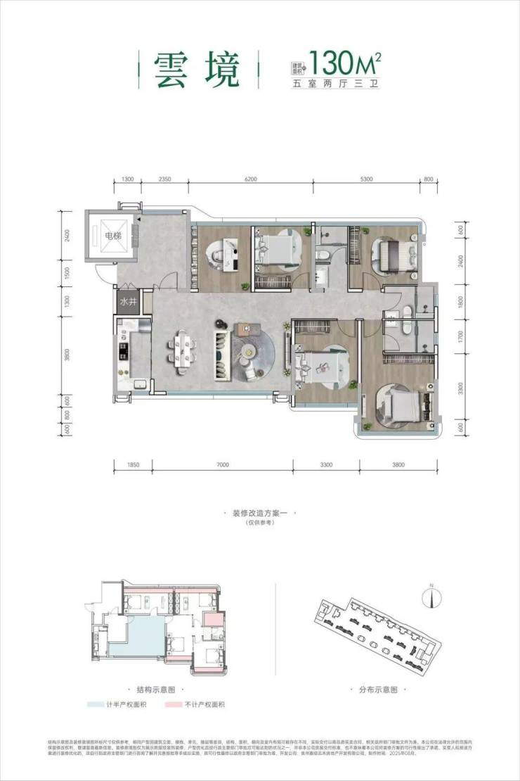 住宅楼栋呈合围式布局,A5号楼为小高层楼王,前后无遮挡,其他楼栋的楼间距均在50米以上。