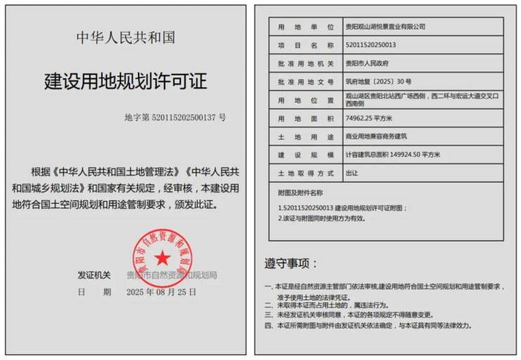 8月26日,据贵阳市自然资源和规划局公示信息,此前由观城运集团拿下的、流言称将布局山姆超市的北站前52011520250013号地块,已获取建设用地规划许可证。