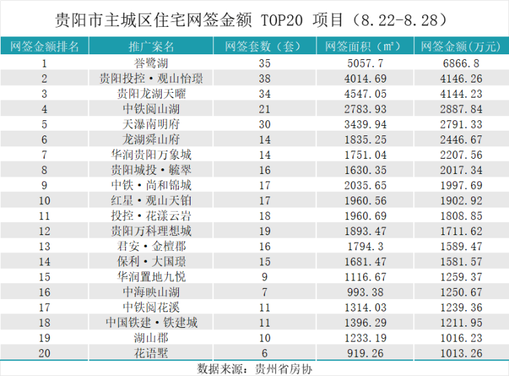 据贵州省房协统计数据,2025年8月22日至2025年8月28日,贵阳主城六区住宅网签金额榜单中: