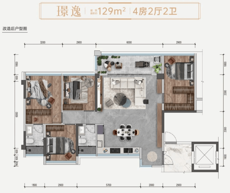 而129㎡户型更是尽显卓越之姿。同样电梯入户的尊贵设计,配备专属独立电梯厅,但增设了更明确的玄关区域,便于收纳与整理。同时,4房两卫的布局,确保了生活空间的宽敞舒适,满足不同生活阶段的需求。约15米的大尺度面宽,让公共活动区域显得尤为开阔明亮,为居家生活注入无限活力。而约6米宽的观景阳台,更是将自然风光引入室内,尽显生活品质之卓越。