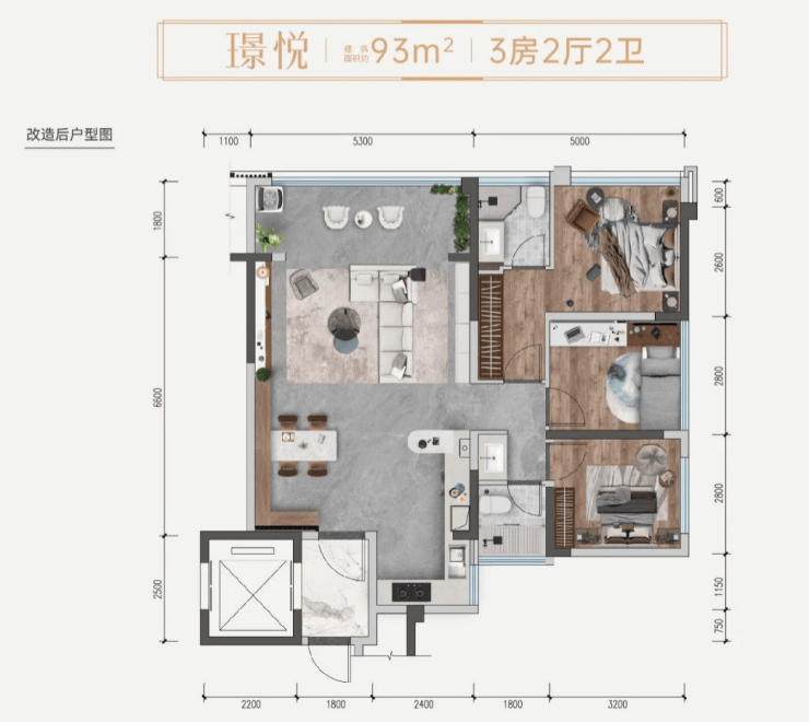 其中,93㎡户型,动静分离,经典实用,面积赠送也可圈可点,提高了得房率,轻松实现三房两卫的宽敞布局。同时,还做到了电梯入户,配备专属独立电梯厅,为业主增添一份尊崇与仪式感。而5.3米的超宽客厅开间,约5米开间的奢阔主卧,更是品质生活与舒适享受的完美诠释。