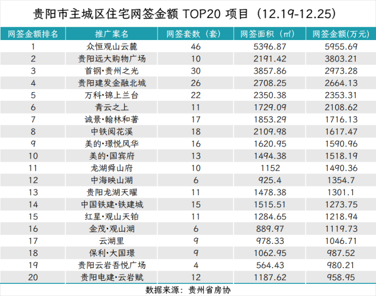 据贵州省房协统计数据,2025年12月19日至2025年12月25日,贵阳主城六区住宅网签金额榜单中: