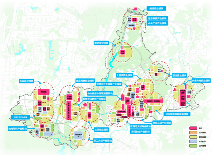 深化市区联动,差异化功能布局:结合各片区现状优质资源分布特征及产业功能布局,引导更新改造地块差异化功能布局,缝合城市功能裂隙,添补配套设施短板,提高品质、激发活力。
