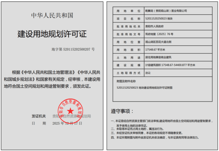 其中,52011520250023号地块由乾麟龙集团以约3302元/平方米楼面价获取,用以开发乾麟龙观宸项目二期。