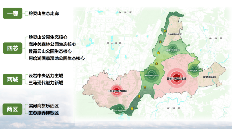 “四芯”为黔灵山公园生态核心、鹿冲关森林公园生态核心、登高云山公园生态核心、阿哈湖国家湿地公园生态核心;