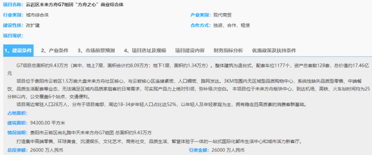 2025年12月25日,云岩区未来方舟G7组团“方舟之心”商业综合体项目,被纳入贵州省投促局招商项目库,开始公开招商。