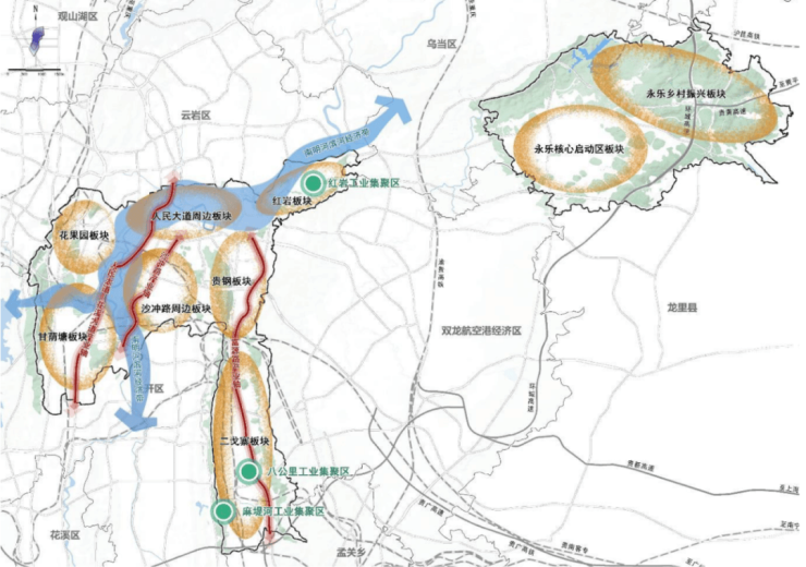 九个产业板块为花果园板块、甘荫塘板块、人民大道周边板块、沙冲路周边板块、贵钢板块、红岩板块、二戈寨板块、永乐核心启动区板块、永乐乡村振兴板块。
