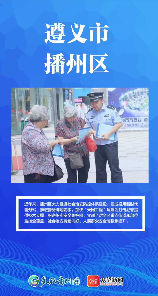 近日,《小康》杂志联合多个国家权威部门和专业机构评选的“百县榜单工程”之“2021中国较具安全感百佳县市”新鲜出炉,贵州省遵义市播州区以92.11分位居榜单第13名,黔东南州雷山县以87.85分位居榜单第93名。