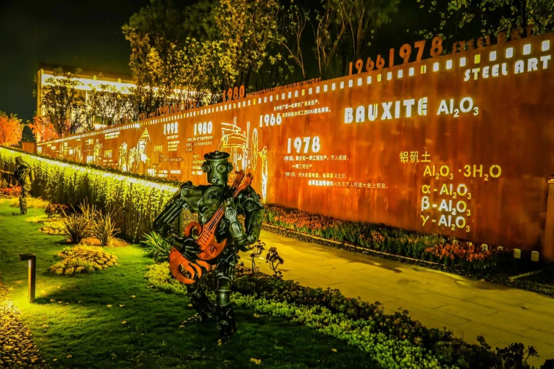 展示中心前,镌刻贵铝沧桑历史的喷绘墙和历史事物、工业“遗产”引人入胜。案场随处可见的水滴雕塑,又碰撞出现代艺术的风格。