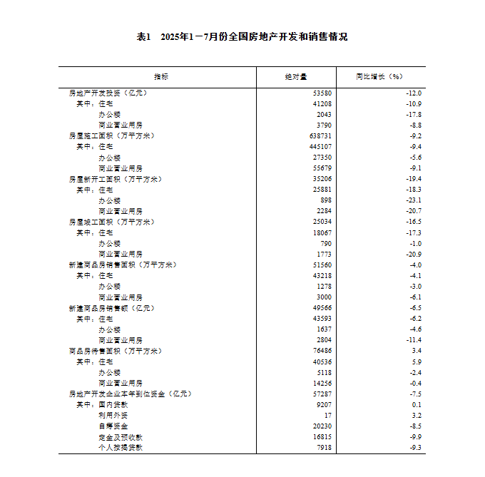1—7月份,全国房地产开发投资53580亿元,同比下降12.0%(按可比口径计算,详见附注6);其中,住宅投资41208亿元,下降10.9%。
