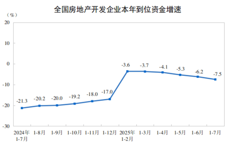 1—7月份,房地产开发企业到位资金57287亿元,同比下降7.5%。其中,国内贷款9207亿元,增长0.1%;利用外资17亿元,增长3.2%;自筹资金23230亿元,下降8.5%;定金及预收款16815亿元,下降9.9%;个人按揭贷款7918亿元,下降9.3%。