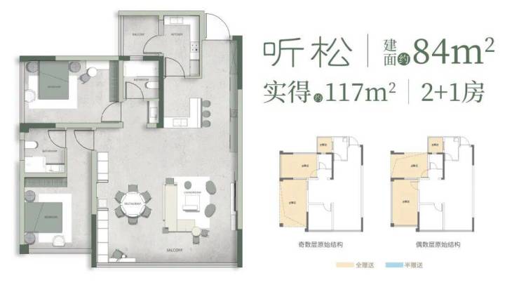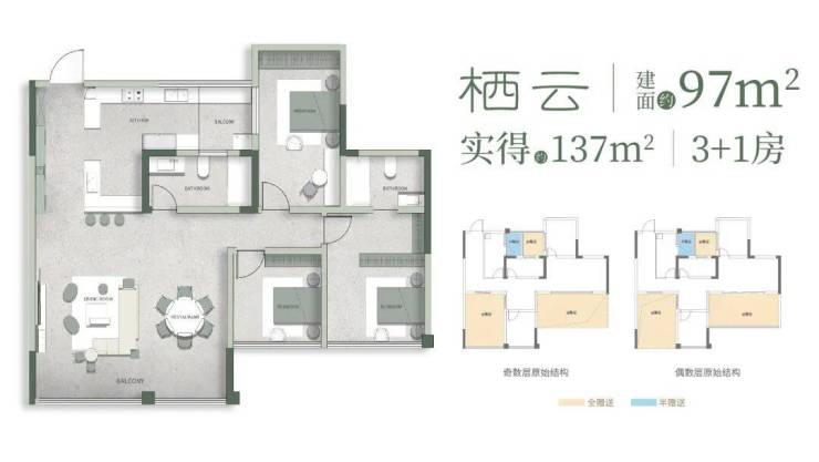 一方面,观山及第的户型保留了实用、门槛较低的优势,空间尺度既能满足一家人的日常活动,又不会大到让人打扫起来都觉得疲惫。另一方面,项目满足了当下户型主流的“0公摊”要求,甚至实现了“负公摊”,得房率高达142%,硬指标十分出色。建面约84㎡实际得房约117㎡,呈2 + 1房格局;建面约97㎡实得约137㎡,为3 + 1房格局,可变空间的设计,为生活赋予了更多的可能性。