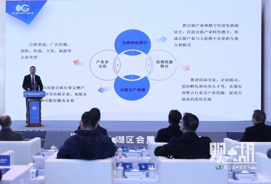 仪式上,观山湖区金融服务中心相关负责人对《观山湖区支持会展业发展专项资金管理办法》(试行)作解读发布、对会展产业孵化园作推介。随后,出席活动的领导共同为观山湖区会展产业孵化园和观山湖区会展特色楼宇揭牌。
