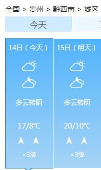 14日夜间到15日白天,省的西部和南部边缘地区多云到晴,北部地区阴天有小雨,其余地区阴天夜间到早晨有零星小雨,中东部地势高处有雨雾;