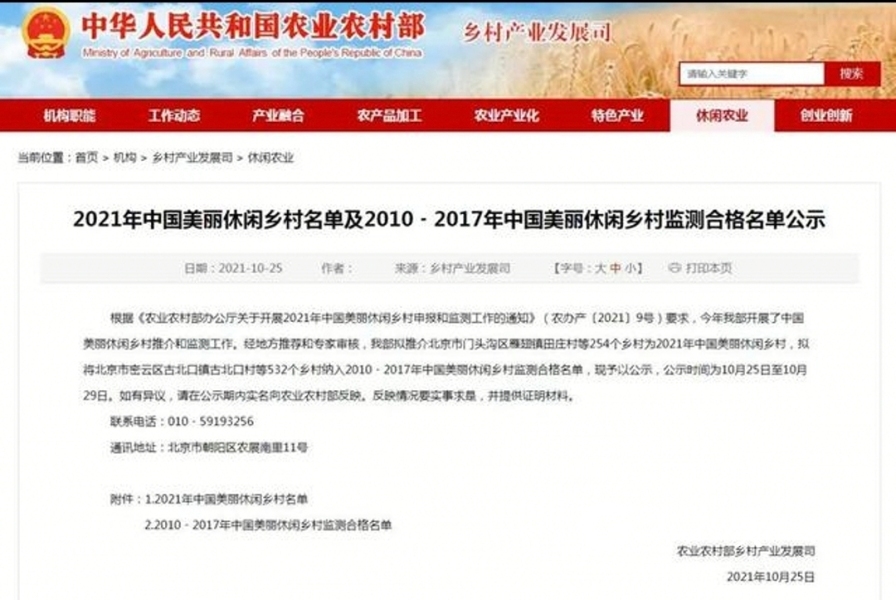 10月25日,农业农村部对2021年中国美丽休闲乡村名单进行公示,全国共有254个乡村入选,其中贵州有8个村上榜。