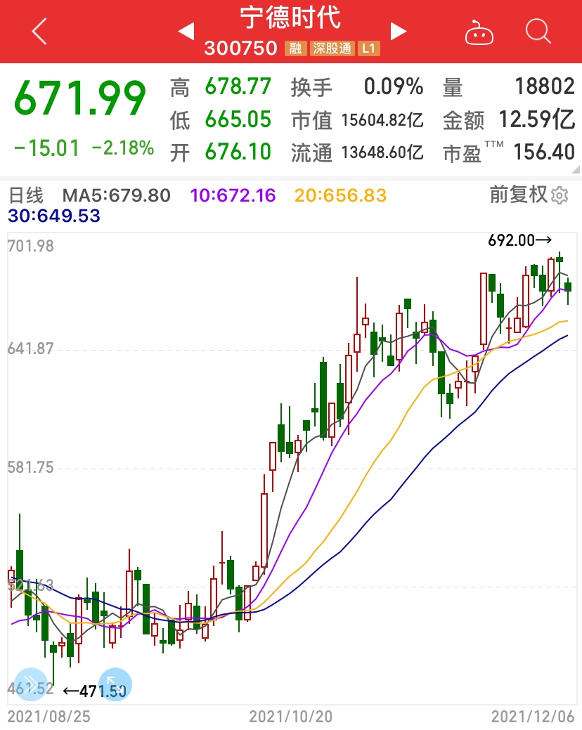 截止发稿,宁德时代报671.99元/股,跌2.18%。