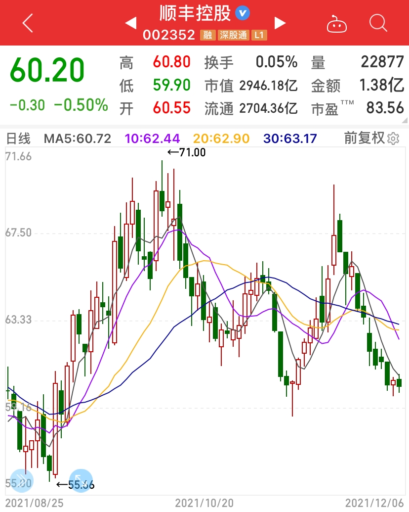 截止发稿,顺丰控股报60.02元/股,跌0.50%。