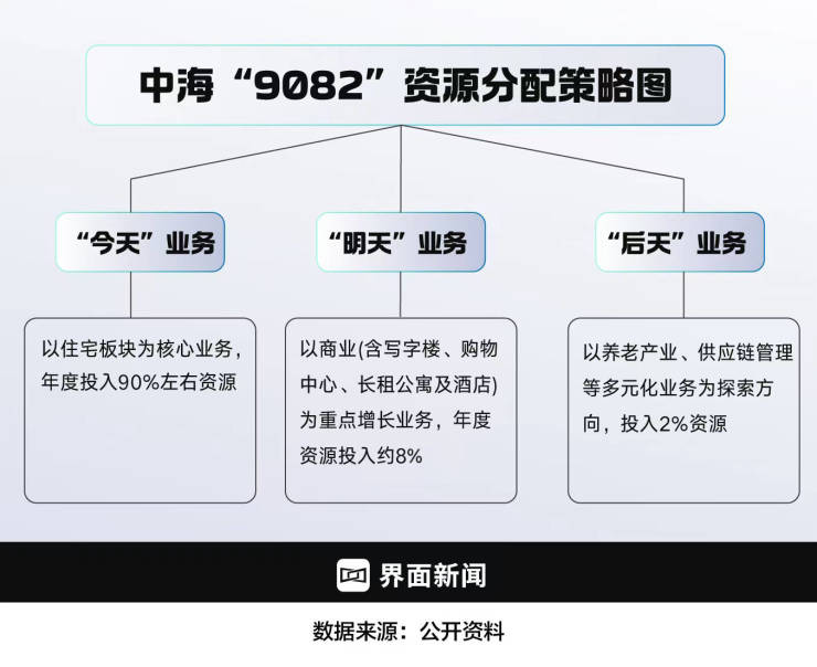 2019年,中海集团董事长颜建国就在公开场合就明确了“今天、明天、后天”的可持续发展战略,以及与之对应的“9082”资源分配策略。在此框架下,整个商业条线作为“明天”的业务,享有8%的资源投入。
