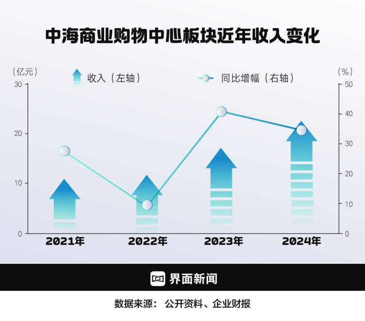 截至2024年,在全国15座核心城市已有30余座中海环宇项目,资产规模超400万平米,购物中心收入达22.6亿元,同比上涨34.6%,四年复合增长率27.1%。它们共同组成了这家地产央企的商业板块,中海商业。