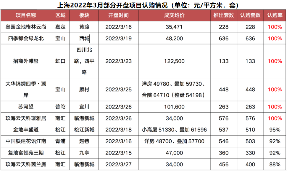 具体来看,3月上海9个入市项目中,5个项目触发积分摇号,认筹率200%左右,入市项目平均去化率在90%以上。即便销售最差的项目去化率也高达80%以上。