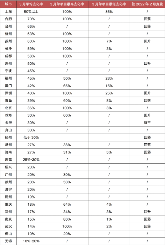 3月份合肥的平均去化率达70%,虽然市区商品房供应35万平方米,一改年初供应不足的窘境,但供应量同比腰斩、成交同比下降近3成。台州3月平均去化率达66%,虽然一手商品房供应和网签备案总量均有所回升,但从近一年情况来看,网签备案量仍处于低位。3月平均去化率高达63%的杭州,市场热度仍然体现在主城区。