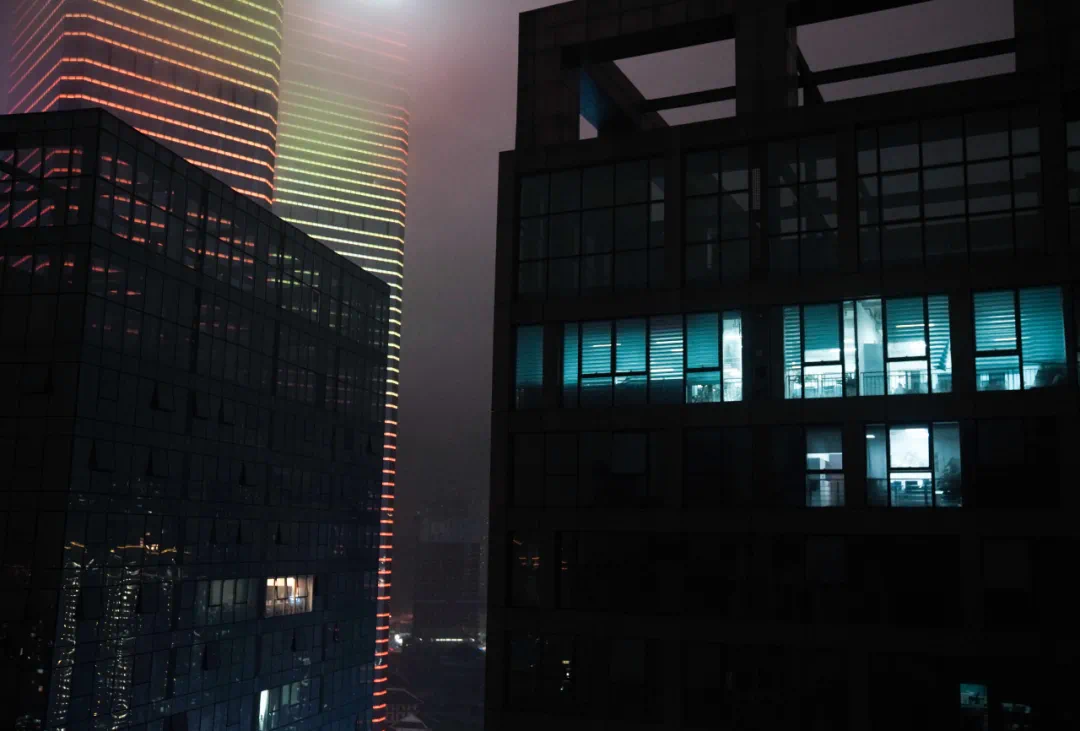 (深夜11点钟,国际贸易中心双子塔仍有办公室的灯光亮着)