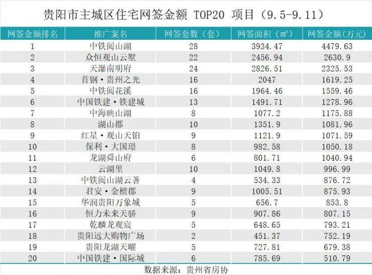 据贵州省房协统计数据,2025年9月5日至2025年9月11日,贵阳主城六区住宅网签金额榜单中: