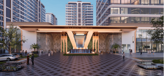 艺术砖铺装主入口宽广前场,高定奢石打造昭示性归家界面