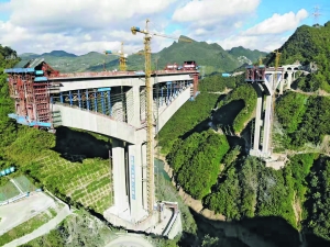 据介绍,甘溪特大桥位于黔南苗族布依族自治州贵定县,是在建贵黄高速控制性工程之一。该桥是世界上第二座空腹式钢构桥,主桥跨度组合为155米+300米+155米,300米主跨为在建同类桥型世界排名前列。