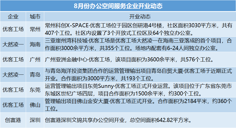 8月份,办公空间服务商开业速度放缓。据观点指数观察,头部企业仅优客工场和创富港有新增开业项目。