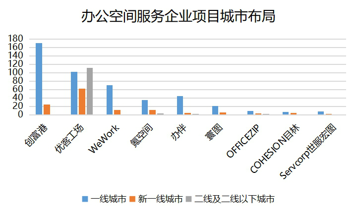 此外,不少快速成长的办公空间服务企业如优客工场、氪空间、OFFICEZIP等在新一线城市或二线及二线以下城市拓展速度逐渐加快。其中,优客工场已签约282个办公空间项目,分布于一线城市的有102个,新一线城市62个,二线及二线以下城市112个。