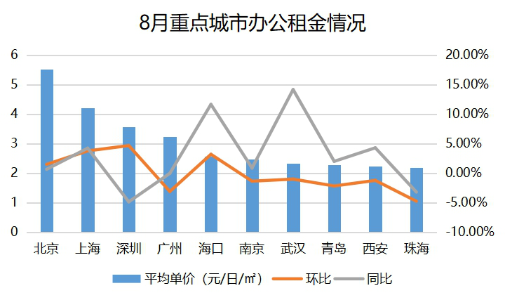 从全国重点一二线城市整体办公租金水平来看,8月份北京是少有一个办公日租金超过5元/日/平方米的城市,其次是上海4.22元/日/平方米,广州和深圳日租金水平相差不大。
