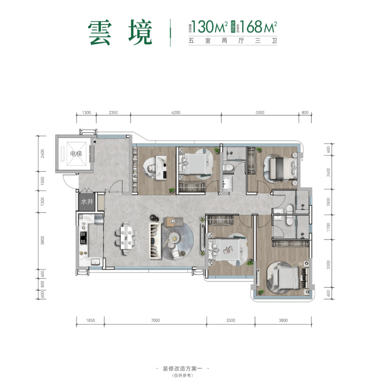 约130㎡户型,实得约168㎡,户型设计灵活多变,既可以设计为双主卧布局,也能打造为五居室,充分满足不同家庭的居住需求,充满改善型住宅的松弛感。电梯直达入户,约 10㎡入户光厅,餐客空间超过 35㎡,加上约 7 米大横厅,纯 T2 板楼南北通透,无疑是贵阳改善型购房者的优选之作。