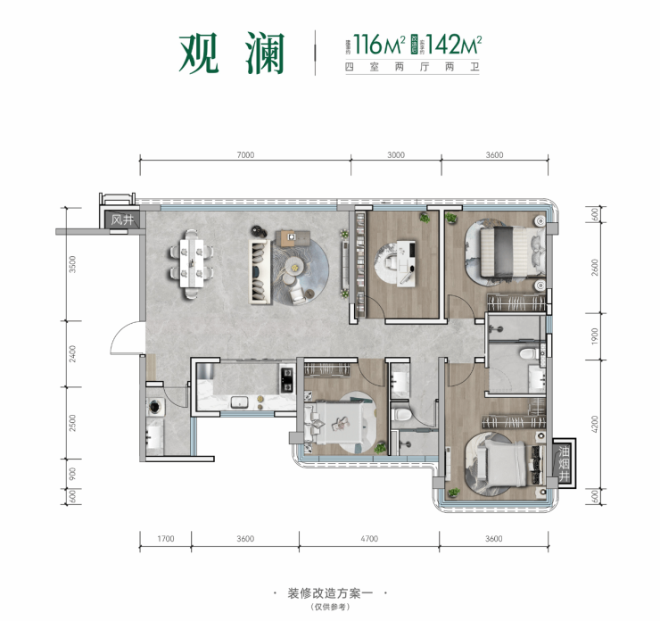 约116㎡户型,实得约142㎡,空间的尺度感再次升级,约7m面宽的LDK一体化景观宽厅,尽显家庭社交聚场的阔气,而灵动四房搭配超宽绰酒店式套卧,更是全家的舒适之选;