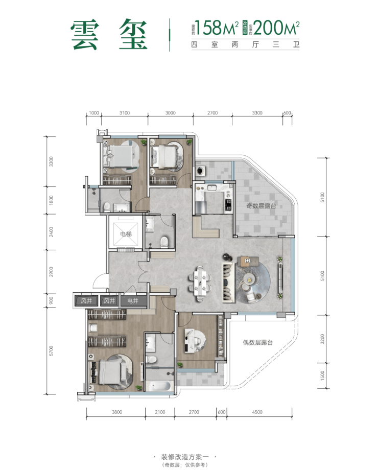 约 158㎡户型,实得约 200㎡,能够满足成功家庭生活场景的进阶需求,完美呈现出功能明晰、尺度阔绰的生活体系。空中大露台的设计,更是融入天地自然,为生活增添了更多的多元可能。