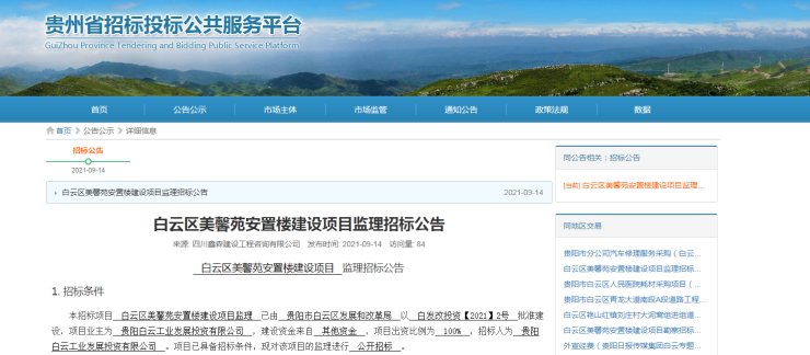 9月14日,从贵州省招投标公共服务平台,白云区美馨苑安置楼建设项目监理招标公告发布。
